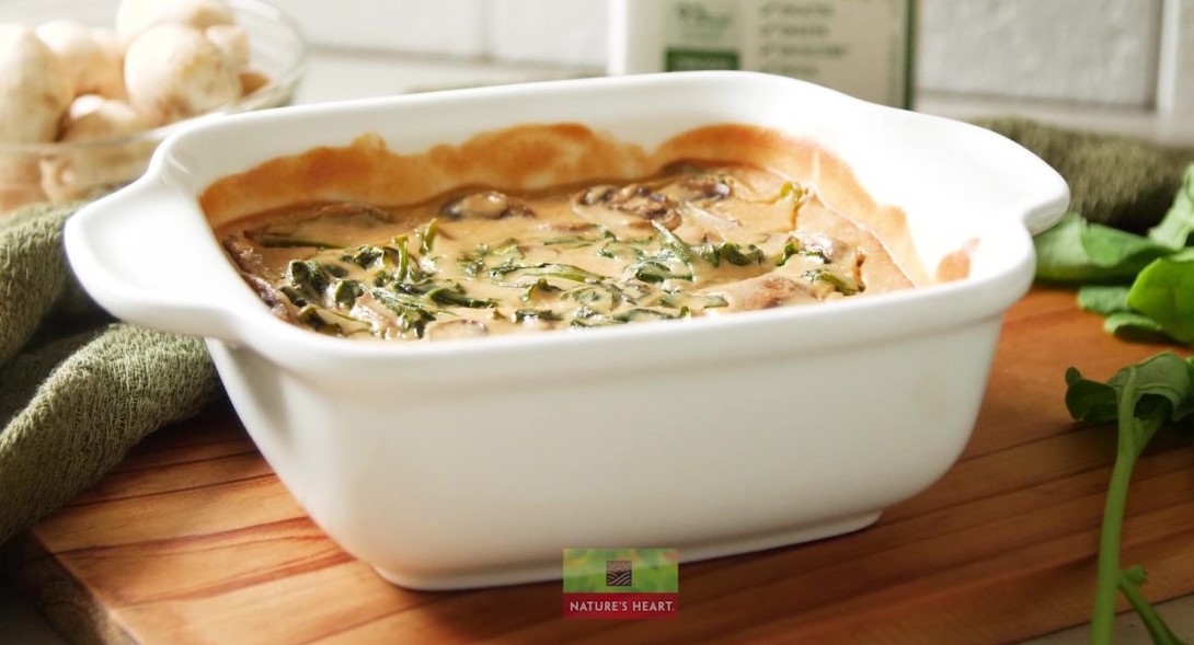 No Liquidificador, coloque os ingredientes restantes. Bata e reserve; Em um refratário, coloque o espinafre refogado, o cogumelo e o molho; Misture e leve ao forno por em média 15 minutos.