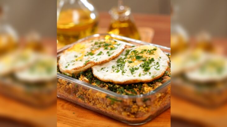 Arroz integral e feijão tropeiro com couve, ovo e farinha de milho